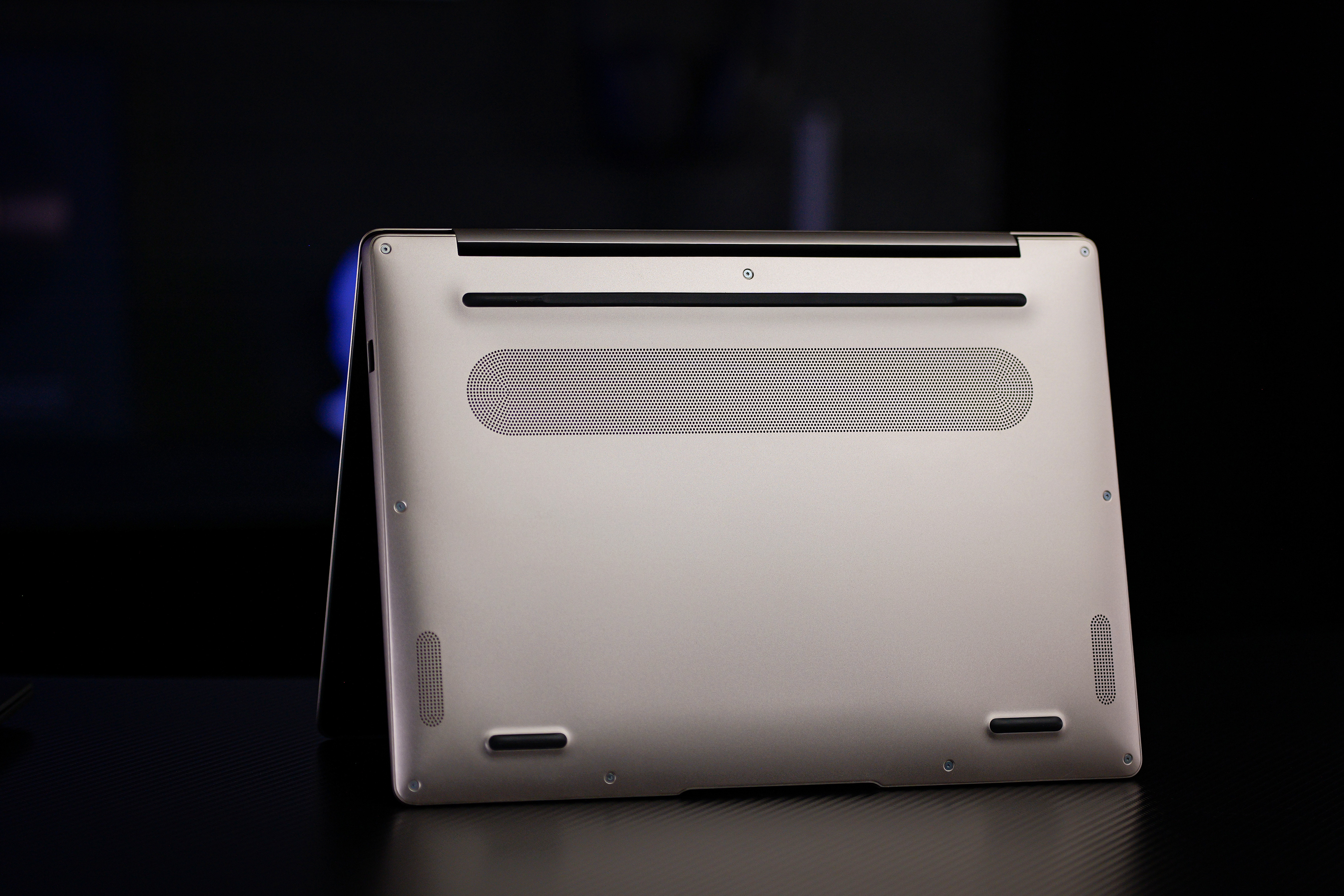 Hi MateBook 14 电源键集成指纹识别,一键登录安全便捷,边缘亮面切边设计尽显高级感。 底部散热孔延续波点设计语言,排列整齐更显细节。底部脚垫周围也延续涟漪微曲设计,造型更柔和。