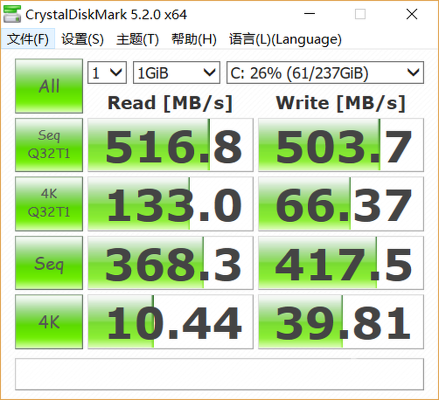 华硕灵耀X搭载了一块镁光1100固态硬盘,采用SATA协议,连续读取速度达到516.8MB/s,连续写入速度达到503.7MB/s,在SATA硬盘中属于不错的读写成绩,可以满足用户日常存储需求。