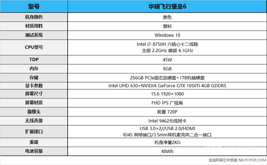 华硕飞行堡垒6较上一代在硬件配置上没有太大变化,选配了英特尔八代酷睿i7-8750H处理器和GTX 1050Ti 4GB GDDR5独立显卡,8GB内存、258GB固态盘+1TB机械硬盘的配置。作为一款主打游戏系列的笔记本电脑,这样的硬件配置基本上可以满足游戏玩家在中高画质下迎战市面上绝大多数游戏大作的需求。