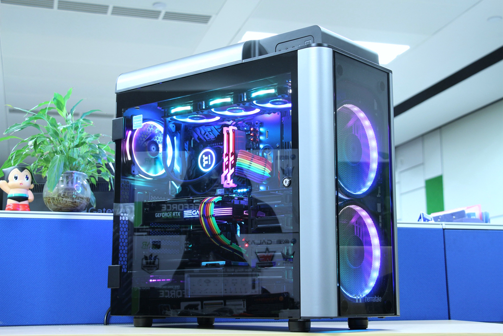 本次选择的是来自TT 20周年纪念款Level 20 GT全塔侧透机箱。TT Level 20 GT的钢化玻璃侧板采用合页式设计,前端金属件加磁铁吸附。机箱出厂后置一颗350px RGB风扇,前面板附带2颗500px RGB风扇,均可连接控制器进行软件调节。
