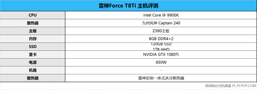 本次测试基于搭载九代酷睿处理器的全新雷神Force T8Ti 游戏主机,在配置上它采用双8GB DDR4大容量内存,并考虑到玩家的游戏需求,采用120GB固态硬盘+1TB机械硬盘的组合方式。在显卡方面略有失望,并没有搭载较新RTX 20系列显卡,而是选择了GTX 1080Ti游戏显卡,游戏性能上同样出色。