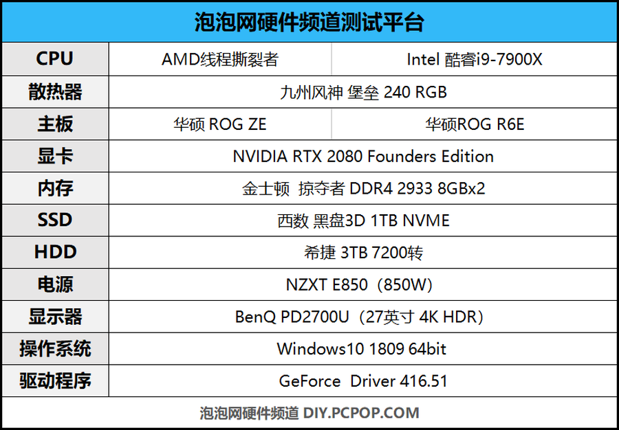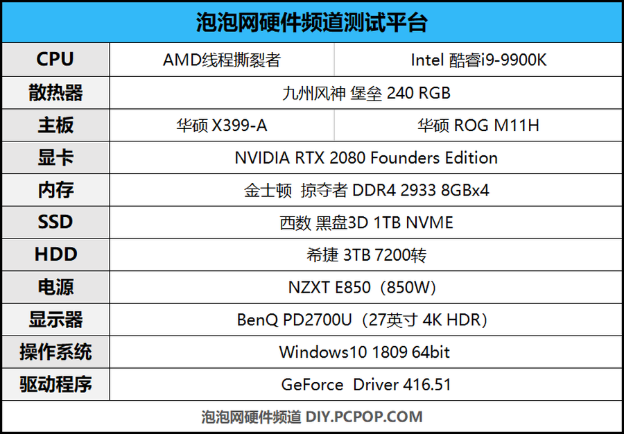 测试平台部分,我们采用了全新的RTX 2080显卡进行测试,同时使用四条DDR4 2933 8GB内存分别组成双通道和四通道(以最大支持为准)。同时升级到较新版本的Windows系统。全程使用水冷散热器进行散热。
