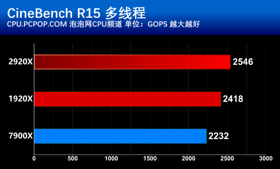 可以看到,在多线程性能上,全新一代线程撕裂者2920X相对于前一代的线程撕裂者1920X有着一定的提升,但幅度并不是很大,基本上与频率的提高幅度。而相对于Intel曾经的旗舰产品酷睿i9-7900X,多出来的2个物理核心和4个线程以及更高的基础频率表现出了应有的水平,在多线程性能上对老对手形成了压制。