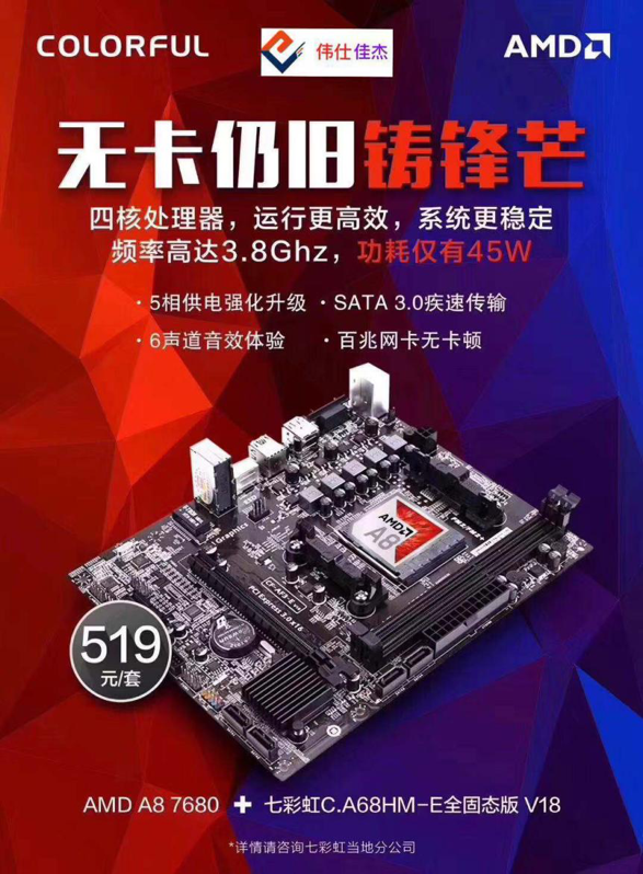 如今的电脑硬件市场中,入门级处理器成为绝大多数用户的优选产品,首先入门级处理器在价格方面十分便宜,其次就是入门级处理器的性能也逐渐强大起来,满足了广大用户的日常所需,所以入门级处理器的火爆也十分合理。而最近一款促销中的经典板U套装让人十分惊喜,由全新AMD APU产品A8-7680处理器搭配七彩虹主板的超值板U套装目前在强力促销中,售价仅为519元,这一价格让广大入门级用户及中小型企业非常激动,并且这款A8-7680处理器+七彩虹主板的性能也很强劲,使用过这款套装的用户都非常满意。如此超值的板U套装对于用户来说相当实惠,用户们还等什么,赶快来抢购吧!