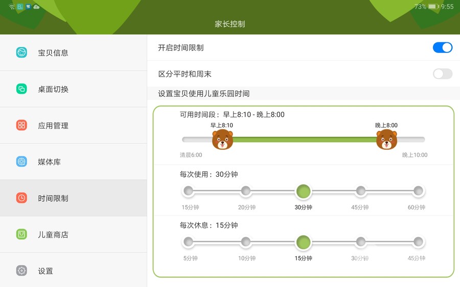 在平板使用时间上,考虑到这台平板的受众人群除了年龄很小的儿童,还有很多大朋友,荣耀在系统中设置了两种严格的时间管理方式。一种是对整个平板的使用时间严格限制,也就是说在“孩子的平板”模式下,会以整个平板的使用时长为限制。