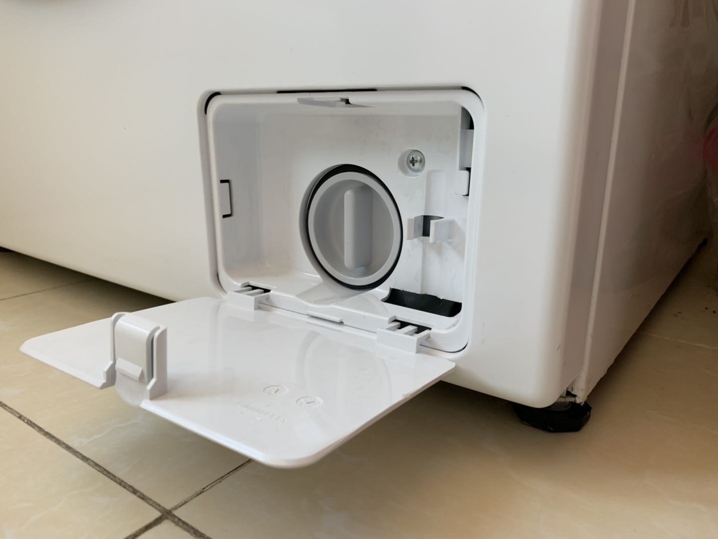 所以这个小门里“藏”的就是滚筒洗衣机的过滤器,也可以把它看作是洗衣机的排污口,下面就把它打开看看里面具体是什么样。