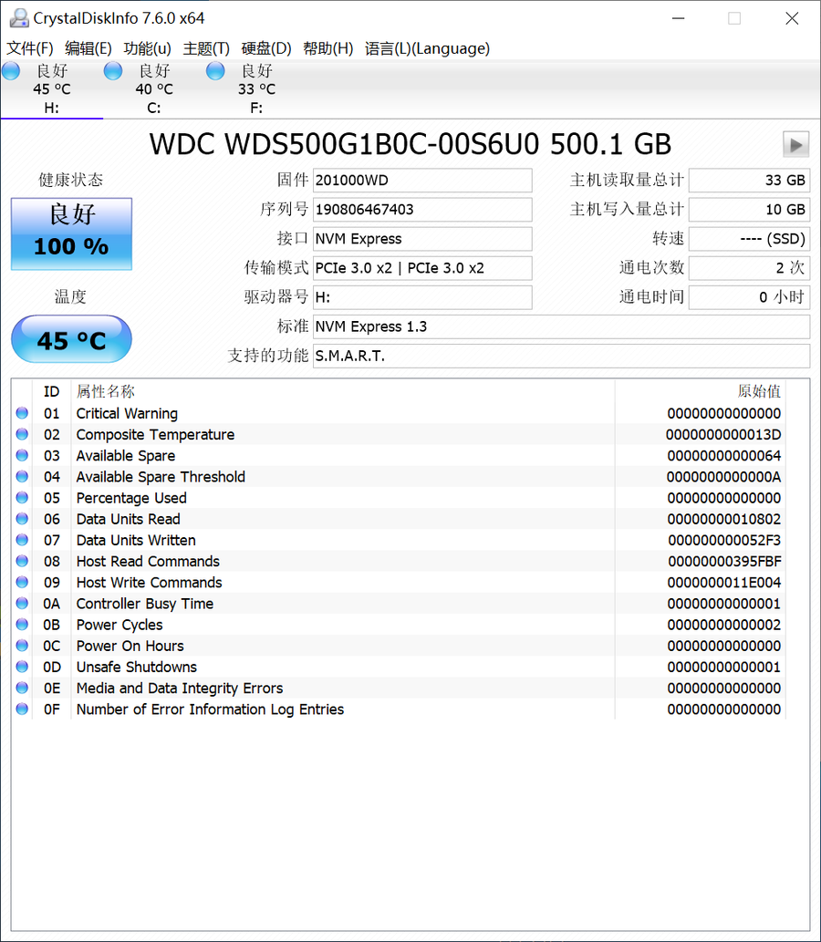 CrystalDIskInfo中可以看到,传输模式为PCIe 3.0 x2,NVMe 1.3标准,支持S.M.A.R.T。当然容量识别仅代表标称值。
