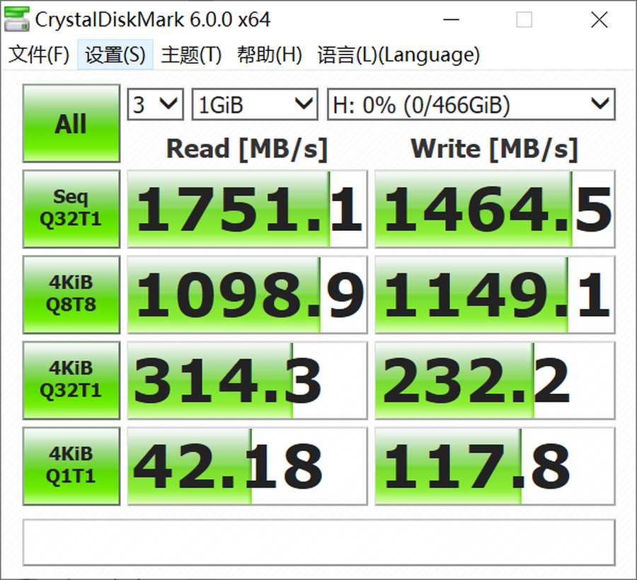在CrystalDiskMark中,持续读取性能达到1751MB/s,持续写入性能也超过了1464MB/s。4K性能也表现好于同级别的PCI-E x2产品。