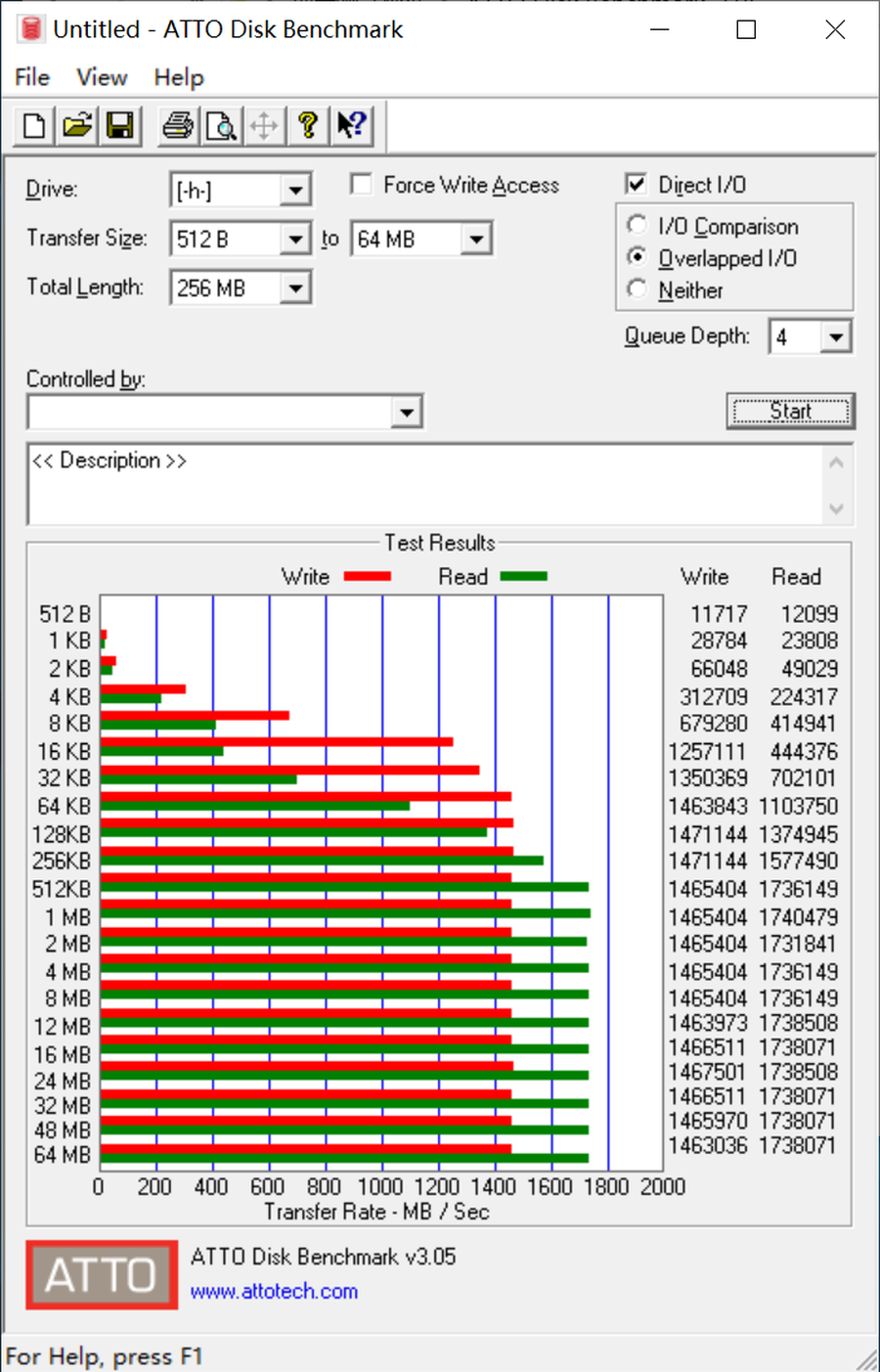 ATTO中的表现则更加夸张,读写高甚至超过了1738MB/s和1466MB/s。已经超出官方标称性能不少。