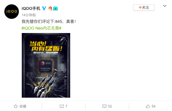 今天,iQOO官方微博通过海报继续曝光iQOO Neo硬件配置:将搭载高通旗舰芯片骁龙845处理器,“生而强悍”的品牌基因再次得到印证。骁龙845处理器作为高通8系列芯片产品中的一员,性能表现依然优异,这使得iQOO Neo手机内“芯”强悍。