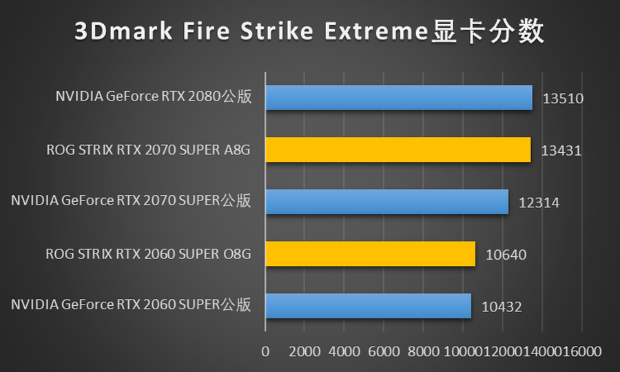 可以看到,ROG的两款非公版显卡测试中表现非常出色,相比FE公版有2%-5%左右的性能领先,其中ROG STRIX RTX 2070 SUPER A8G的性能表现尤为出色,性能表现无限趋近于公版RTX 2080,部分项目的差距小到可以当成误差。