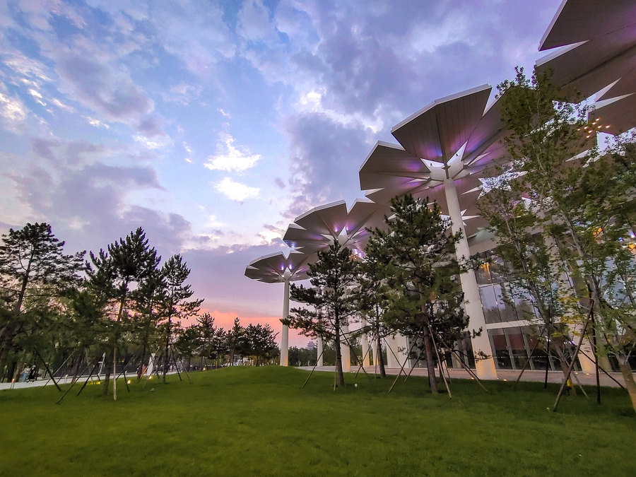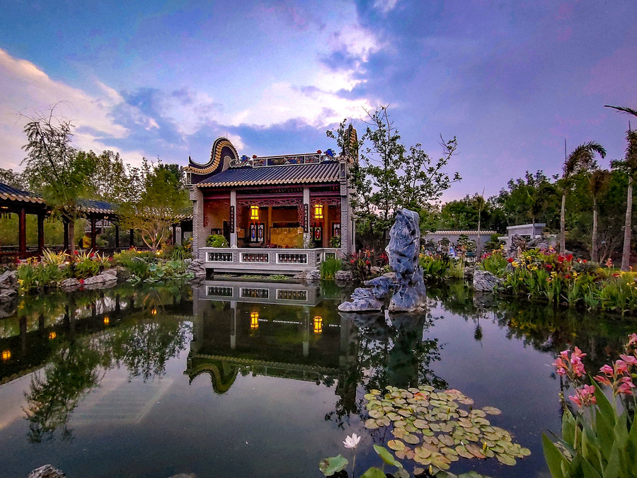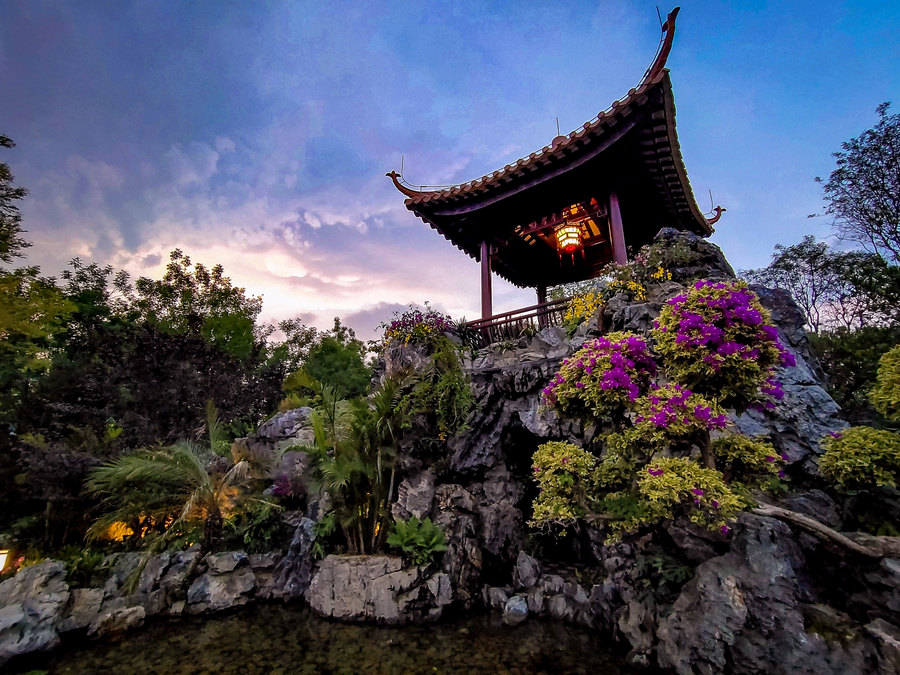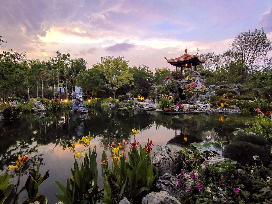 在拍摄暗光环境下的场景时,iQOO Neo的超级逆光模式发挥出更大的优势。正如上面这组照片中所看到的一样,此时已经接近黄昏,也是天空层次与色彩最为丰富的时候,所以自然优先要保障天空的曝光,那么在这样的光线条件下处于暗部的亭子、假山、池塘以及植被等就会欠曝而且画面整体偏暗。但在超级逆光模式下,手机能很好的平衡亮部与暗部的光线,提亮暗部的同时也不损失细节与色彩,12.3EV的动态范围让照片更加漂亮与炫丽。