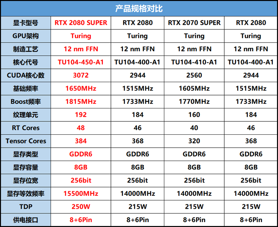 首先我们先来了解一下产品规格,RTX 2080 SUPER采用了全新的TU104-450-A1核心,从代号上来看很像是之前RTX 2080 所采用的TU104-400的升级加强版。而事实上也的确如此,全新的核心增加了两组SM单元,也就是增加了共128个CUDA单元(增加4.3%)、2个RT Core(光追单元)、8个纹理单元、16个Tensor Core(张量计算单元)。同时核心频率也有一定提升,达到了1815MHz。(增加4.7%)