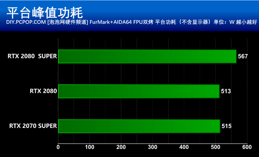 可以看到,RTX 2080 SUPER全平台功耗达到了535W,这个功耗水平还是相当可观的。考虑到电源转化率和一些其他因素,我们建议至少选择650W左右的足额电源产品。