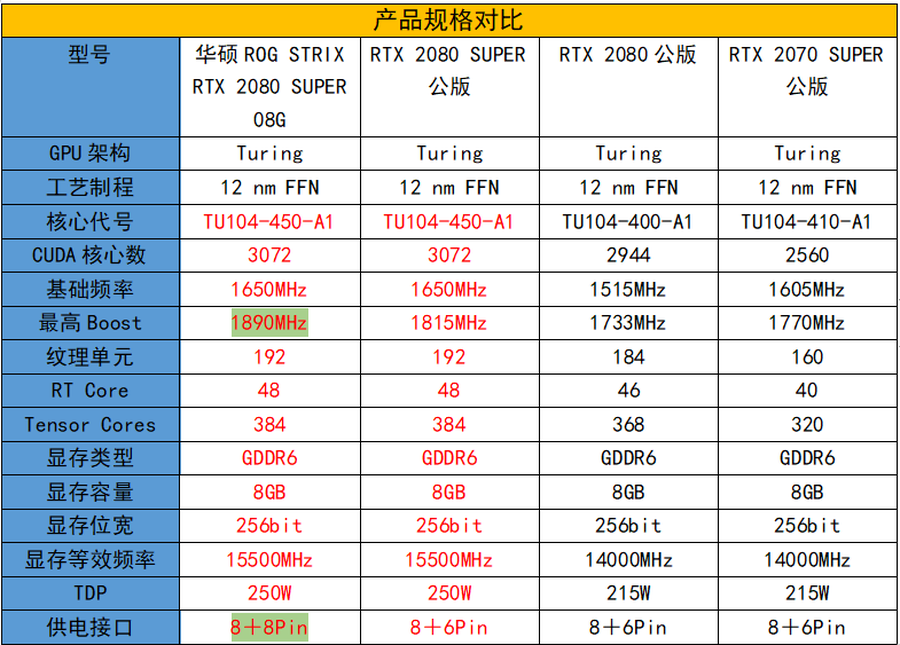 之前讲过,RTX 2080 SUPER的核心规模相比RTX 2080、RTX 2070 SUPER更大,这对性能提升很有帮助。此外,RTX 2080 SUPER的核心频率也非常高,公版RTX 2080 SUPER的基础品类为1650MHz、Boost频率为1815MHz,已经远远超出了RTX 2080和RTX 2070 SUPER。