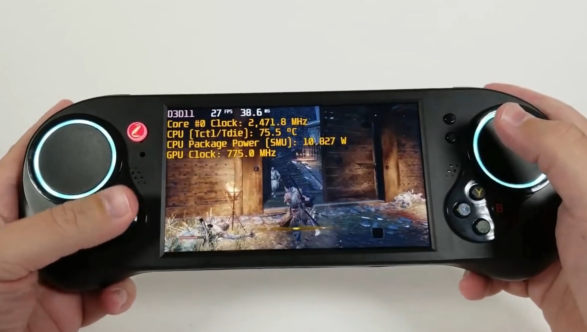 在视频演示中,UP主The Phawx将《只狼》的画面设置为1024×576分辨率、低特效,SMACH Z的游戏帧数很稳定,能全程保持在30帧以上,而因为没有设置锁帧,部分画面甚至能达到57帧,不过视频中SMACH Z的温度问题也十分明显,核心温度基本都在70度以上,有时会超过80度,不知道SMACH Z的机身温度多少,从视频来看应该没有到“烫手”的地步。此外,视频中SMACH Z的两个触控摇杆(蓝环区域)也十分有特色。