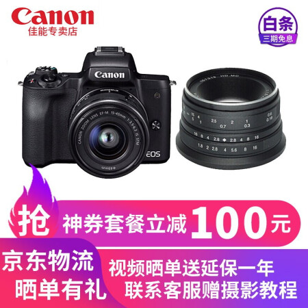 目前佳能(Canon) EOS M50套机(15-45,55-200mm)双镜头微单数码相机vlog相机 黑色64G+七工匠25 1.8镜头套餐在京东商城的售价为5628.00元,点此前往京东购买>>>