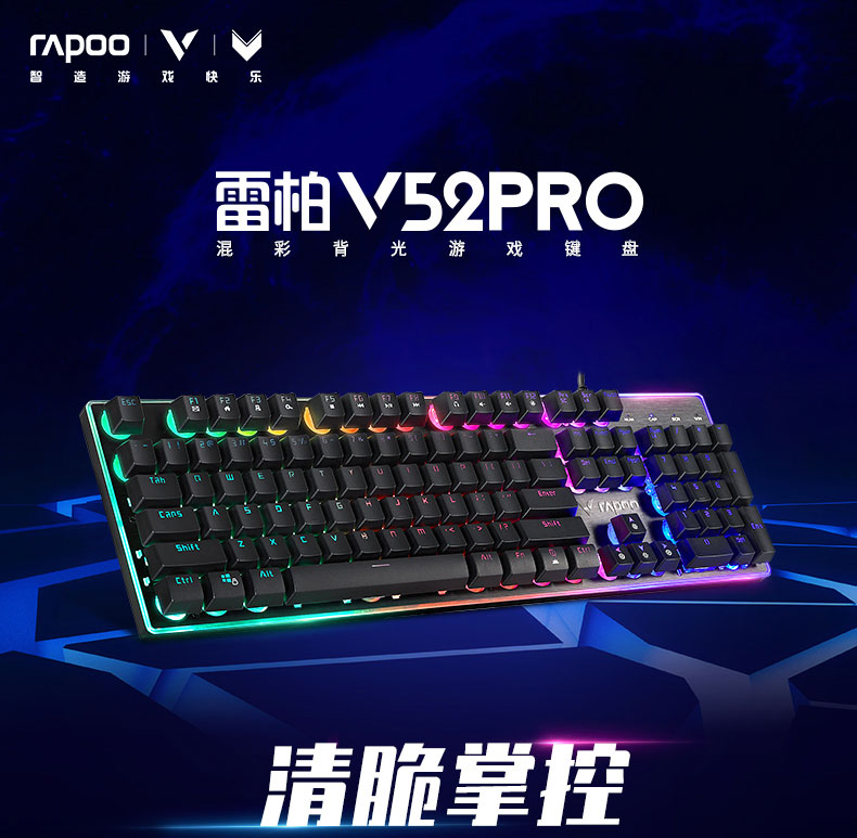 Rapoo雷柏,领军国产外设品牌,实力大厂上市企业为旗下游戏V系列推出了类机械青轴的雅致战键——雷柏V52PRO混彩背光游戏键盘,青轴手感加持的灵动清脆,12种多媒操作的便捷,5种耀眼的背光尽显它的“诱惑”,这样一款169元的战键到底有什么它的独到之处呢?下面紧随笔者的脚步来对它做进一步的了解。