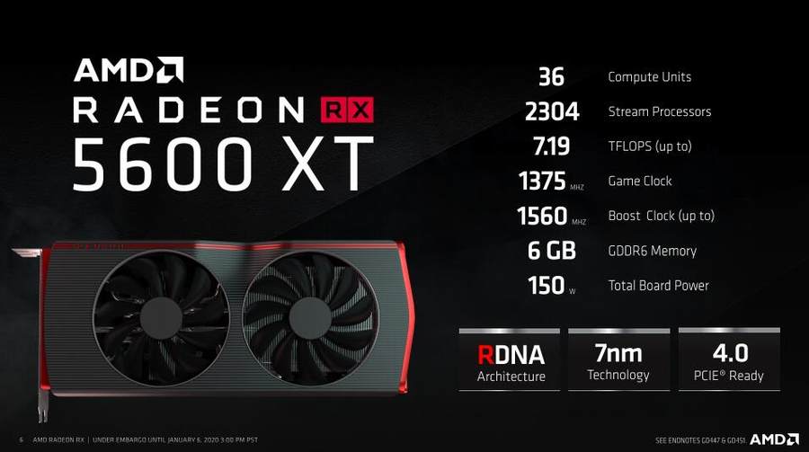 在近日进行的CES 2020上,AMD正式发布了全新的AMD Radeon RX 5600 XT显卡。其基于Navi 10图形处理器打造,采用PCIe 4.0接口,具备2304个流处理器,搭载有192Bit位宽、6GB容量的GDDR6显存。公版卡的基础频率、Boost频率、显存等效频率分别为1130MHz、1560MHz、12000MHz。供电方面,该显卡的TBP为150W,采用单8pin辅助供电接口设计。