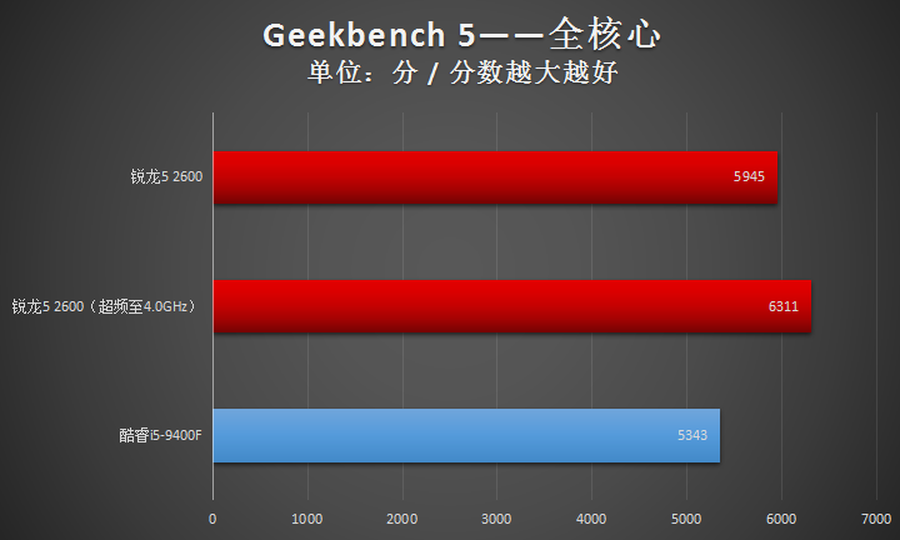 2600单核心性能虽然落后Intel酷睿i5-9400F,但是凭借12线程的优势,其在全核心性能方面则大幅超越了Intel酷睿i5-9400F。
