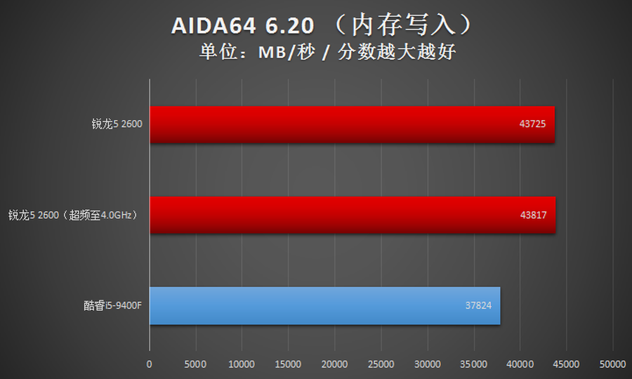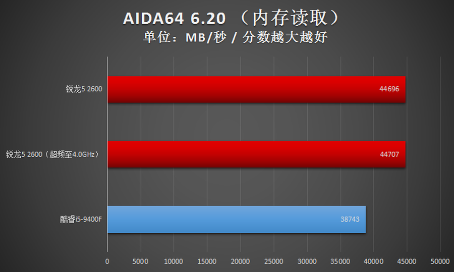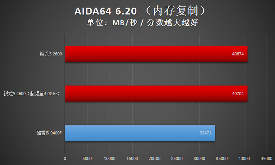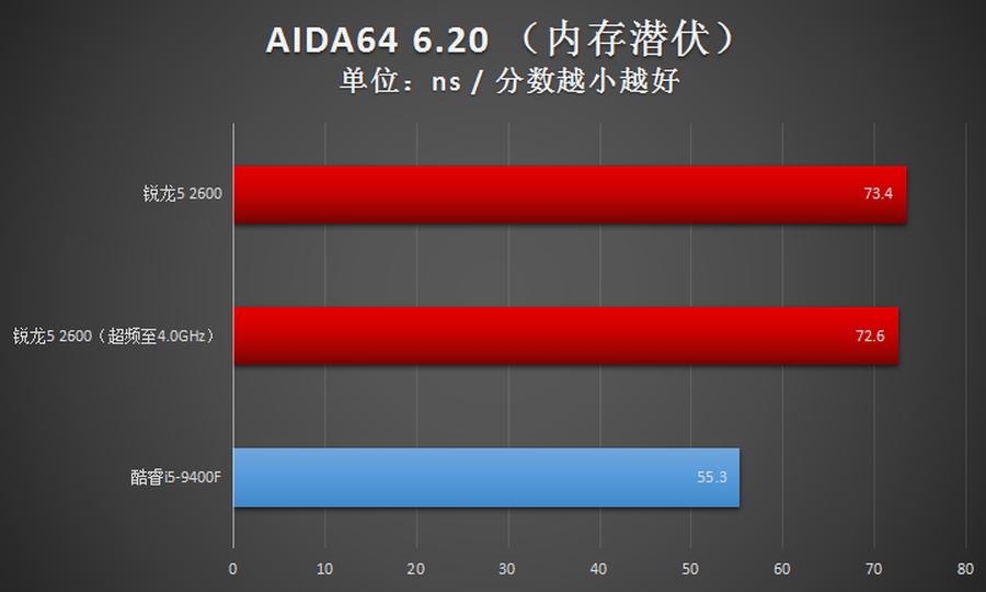 在AIDA64的内存测试项目中,AMD锐龙5 2600只有内存潜伏这一项成绩不如Intel酷睿i5-9400F,其他项目均是领先的。