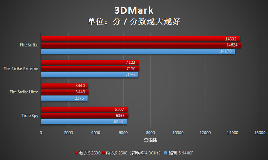从3DMark理论测试的结果来看,AMD锐龙5 2600在游戏方面的表现与Intel酷睿i5-9400F基本一致。