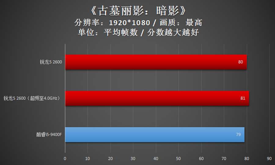在《古墓丽影:暗影》这款游戏中,AMD锐龙5 2600的性能与Intel酷睿i5-9400F基本一致。