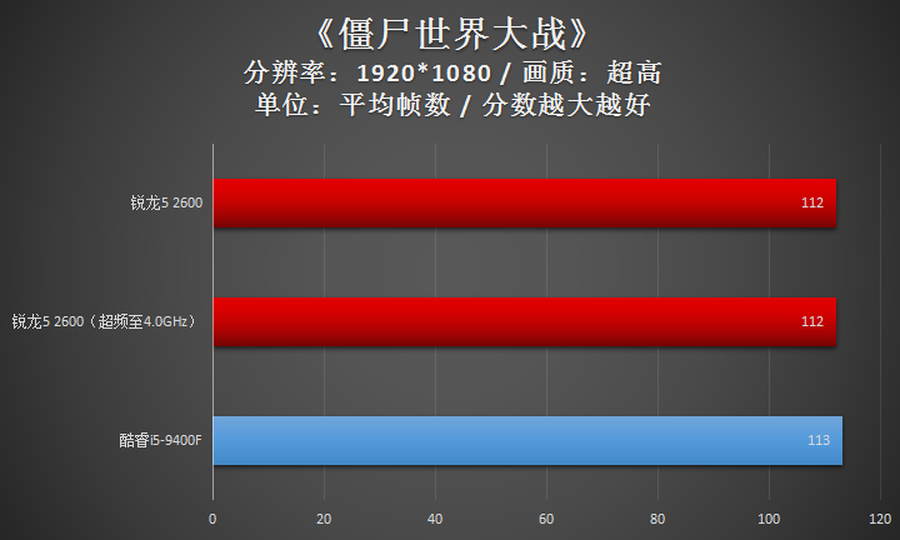 在《僵尸世界大战》这款游戏中,AMD锐龙5 2600的性能同样与Intel酷睿i5-9400F基本一致。
