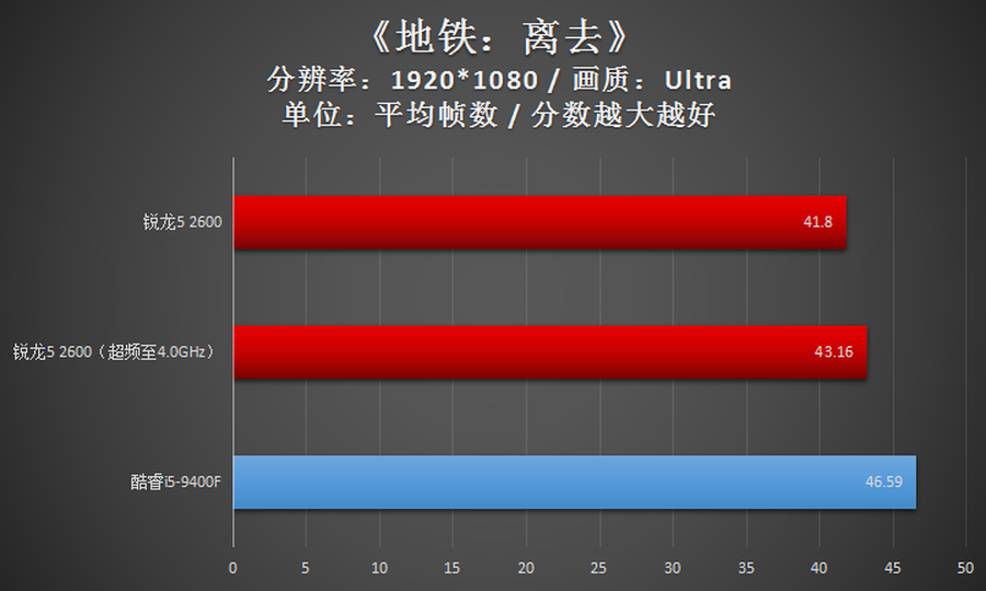 在《地铁:离去》这款游戏中,AMD锐龙5 2600的性能落后于Intel酷睿i5-9400F。