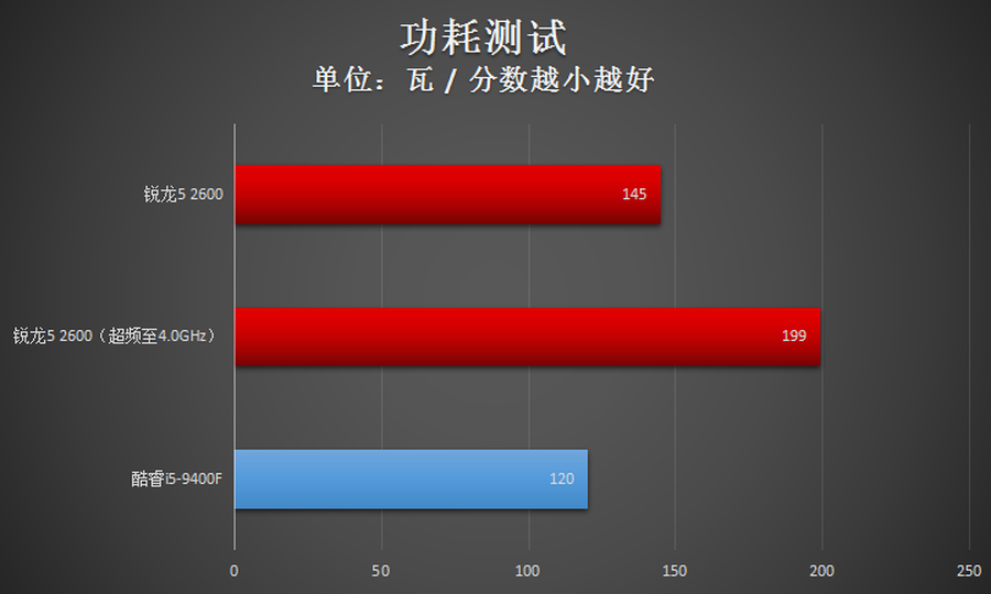默认频率下,AMD锐龙5 2600的功耗只比Intel酷睿i5-9400F高了20多瓦,表现不错。