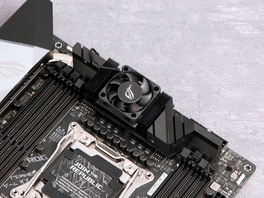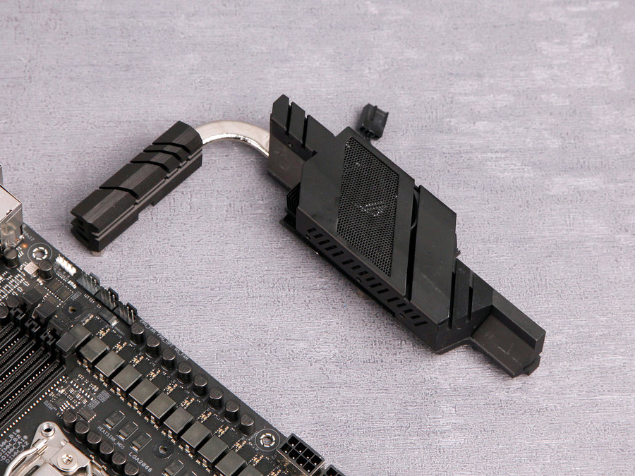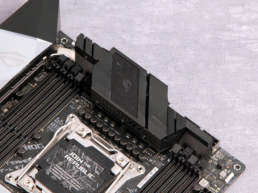 这款主板CPU供电区域的MOS管加装有一体化主动式散热器。