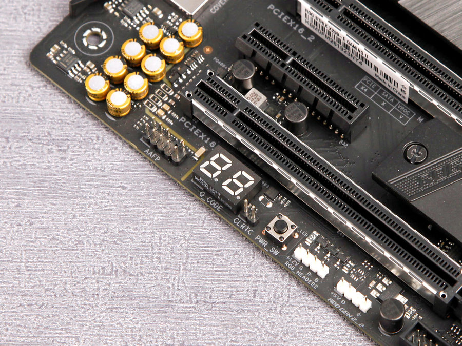 主板PCB的左侧边缘设计了开机键,该键的旁边拥有一个Q-Code侦错灯。