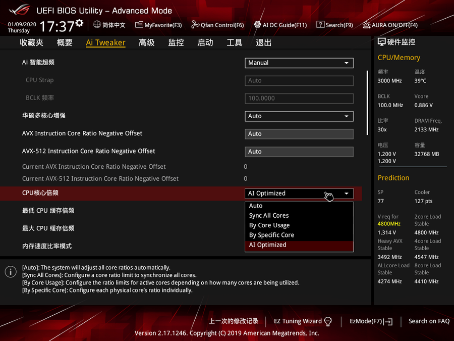 在主板BIOS中找到“CPU核心倍频”选项,然后选择“AI Optimized”设置,AI智能超频在系统重启后即可自动开启。