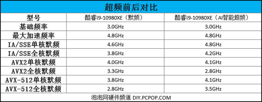 关于酷睿i9-10980XE处理器加载AI智能超频的结果,笔者列出了一张频率对比表格。从中可以看出,当开启AI智能超频功能之后,IA/SSE负载执行频率、AVX2负载执行频率、AVX-512负载执行频率均获得了不同程度的提升。