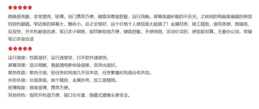 从电商平台的评价可以看到荣耀笔记本14得到了不少用户的肯定,在外观设计、运行速度以及便携性等方面都收到了不少用户的好评。