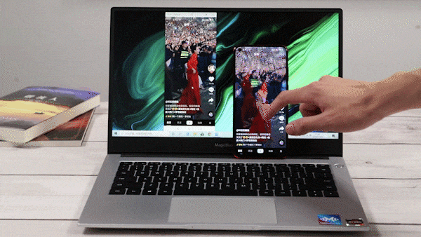 值得一提的是,荣耀笔记本14锐龙版搭载全新多屏协同功能,可与手机实现跨系统的实时互动。可以在电脑上刷微博、抖音等,也能通过电脑端键盘鼠标控制手机。
