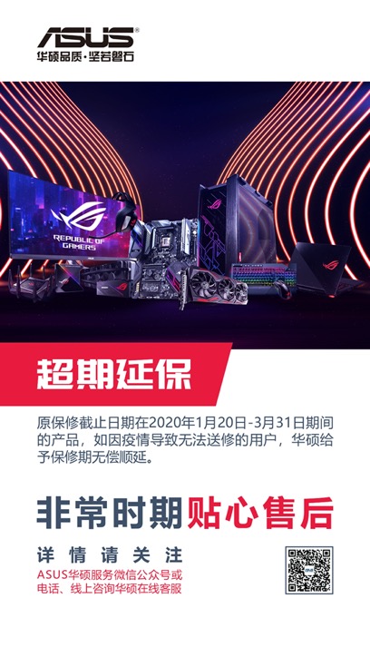 首先,华硕推出超期延保服务:若原保修截止日期在2020年1月20日-3月31日期间的产品,如因疫情导致无法送修的产品,华硕给予保修期无偿顺延。在此期间产品保修到期的用户敬请放心,疫情过后,华硕倾心为您服务。