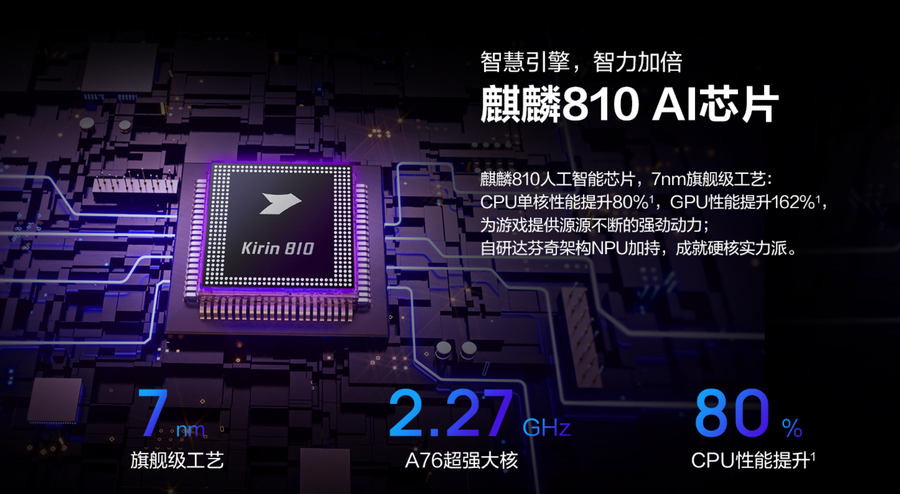 荣耀20S搭载7nm工艺制程的麒麟810芯片,采用全新超级文件系统、支持GPU Turbo 3.0、方舟编译器等,日常使用和玩游戏都能获得出色的体验。另外,配备了3750mAh大容量电池、20W快充。