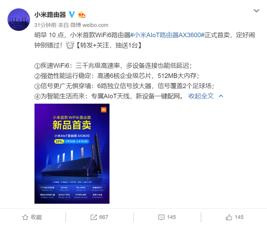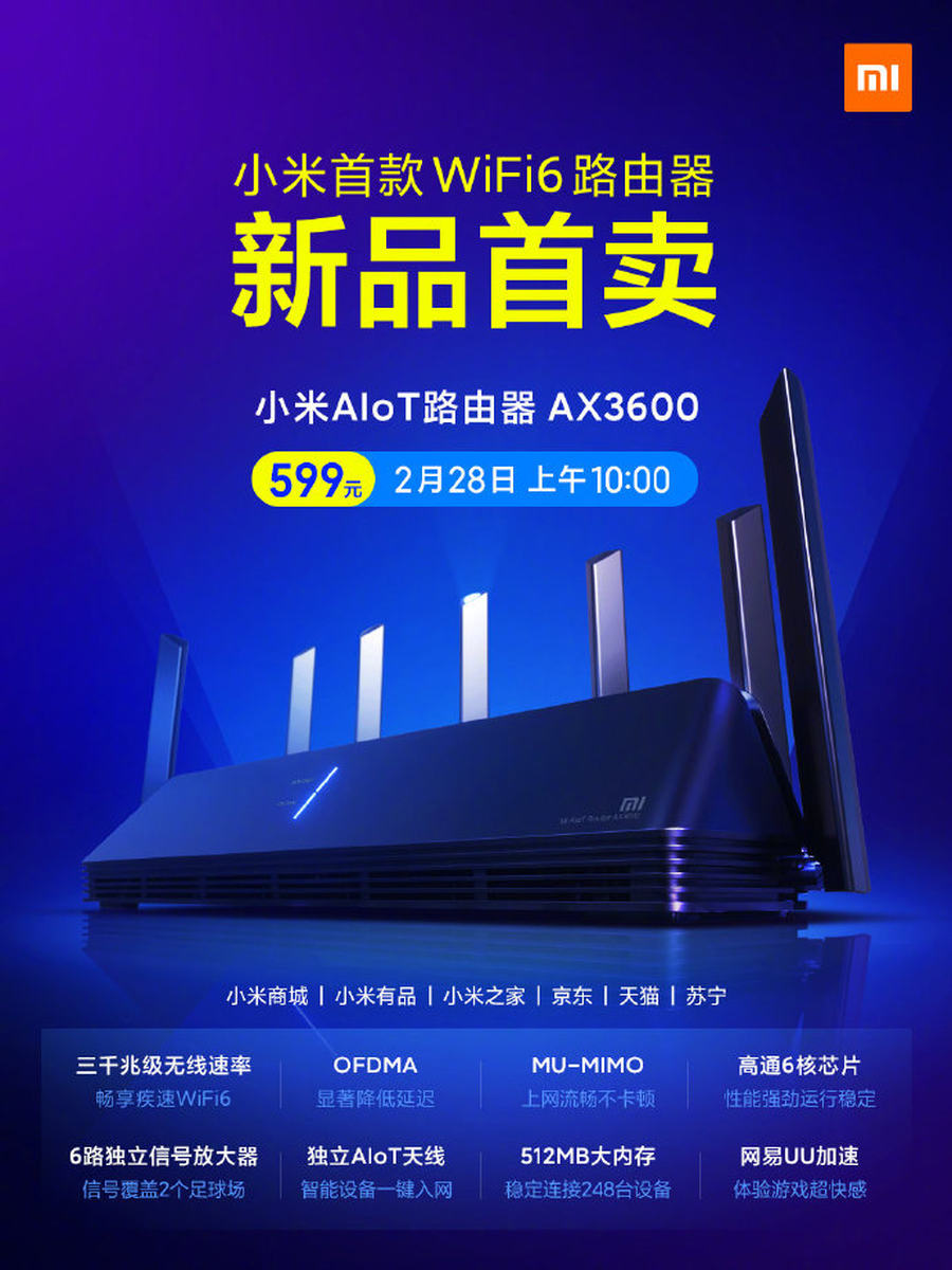 2月27日,小米路由器官方宣布,小米先进WiFi6路由器小米AIoT路由器AX3600将于明天开售,售价599元。