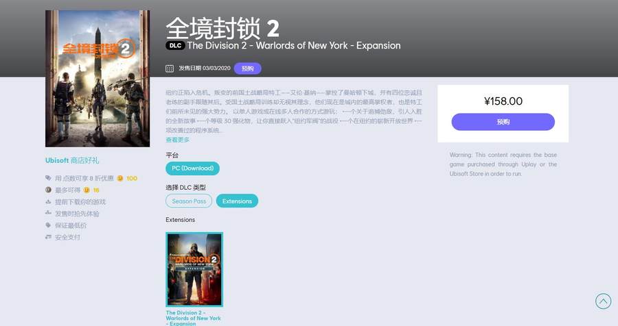 “纽约军阀”是《全境封锁2》的DLC,售价158元,需要拥有游戏本体才能游玩。除了一个崭新的开放世界(纽约)和延伸的游戏终局外,购买“纽约军阀”DLC的玩家能得到直升到Lv30的道具,可直接跃入“纽约军阀”战役,同时等级上线提升到40级,并开放了新的道具、装备及技能。