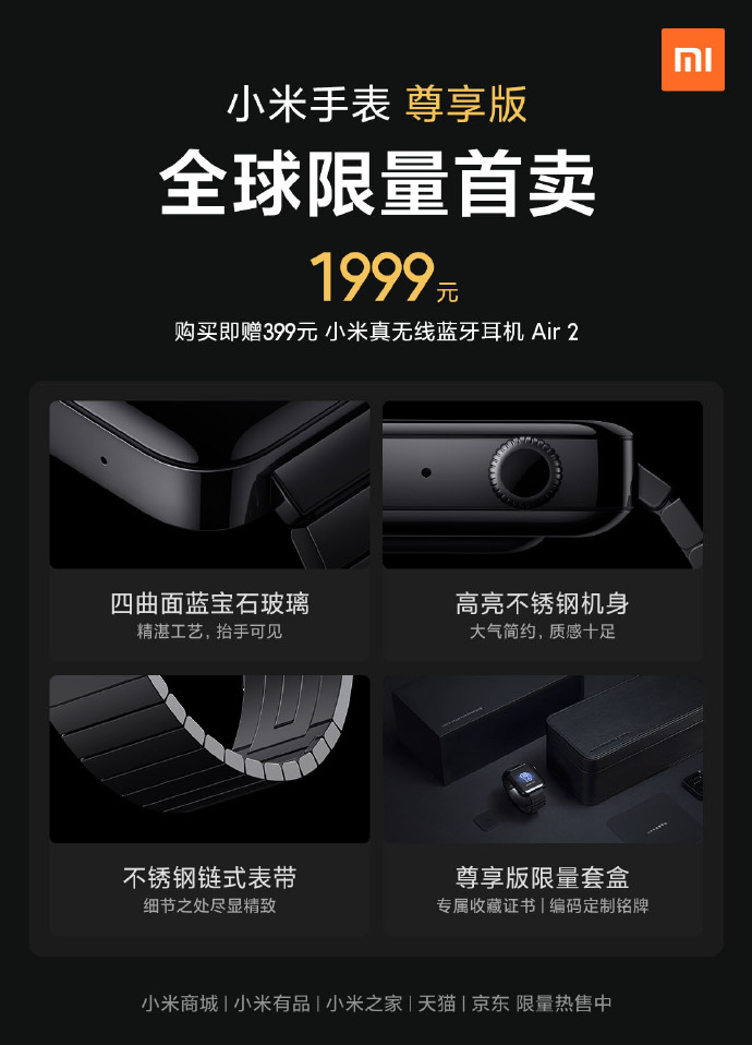 3月3日消息,今日@米家MIJIA官方微博发布消息称,小米手表尊享版的全球限量首卖活动目前已正式开启。尊享版的定价为1999元,购买还将获赠价值399元的小米真无线蓝牙耳机 Air 2。