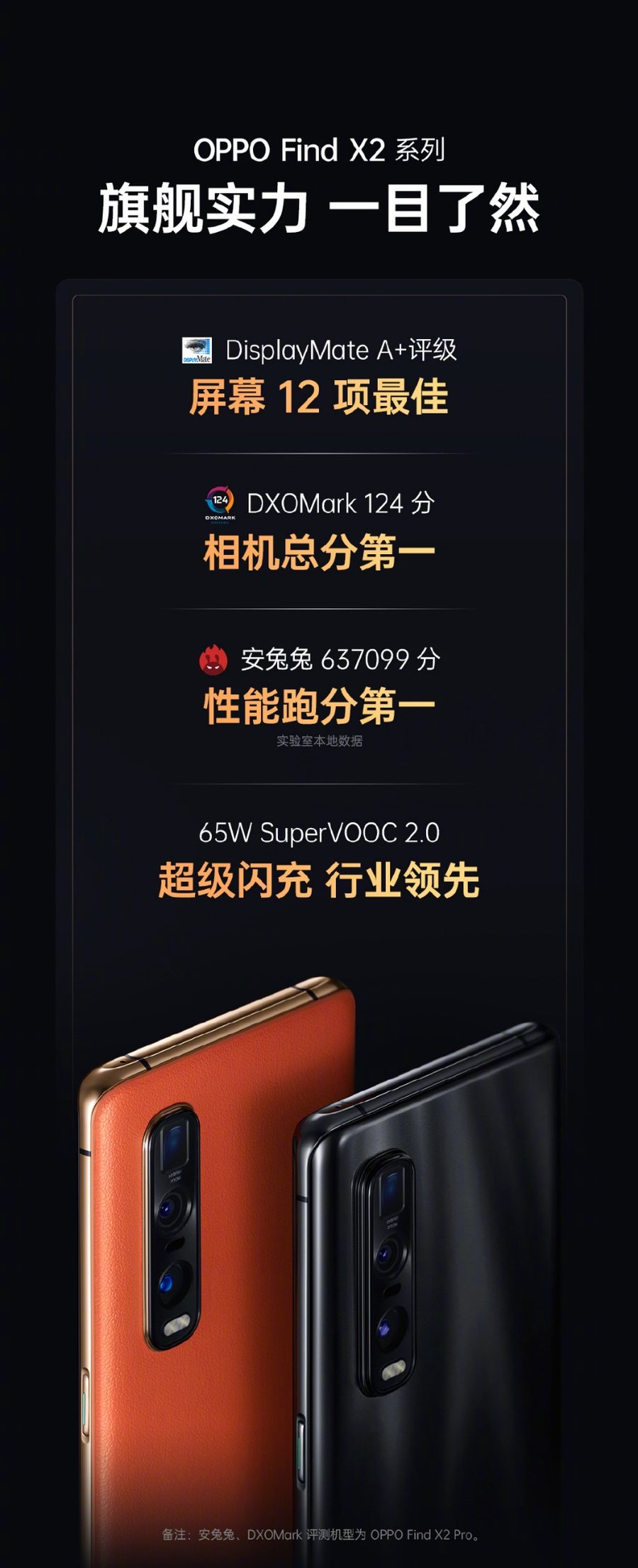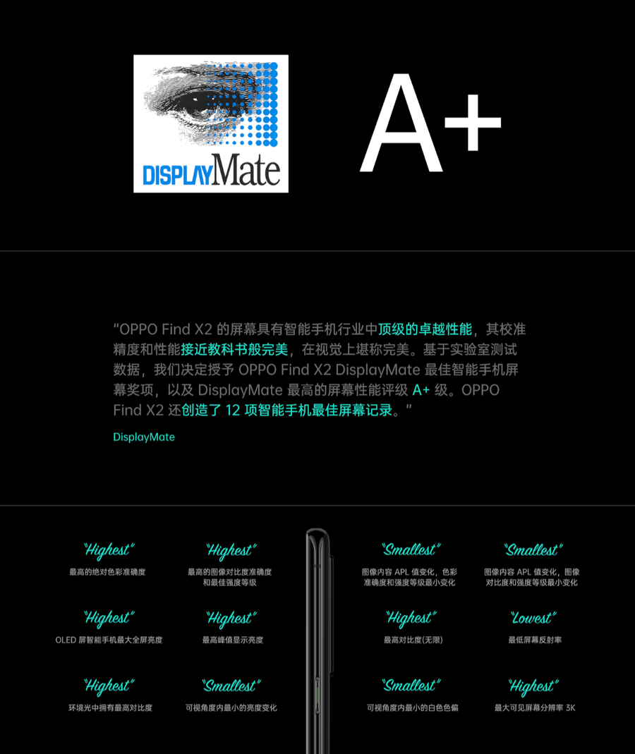 在OPPO官方公布了一张海报中,就直观地展示了Find X2 Pro的所有优势,其中就有特别亮眼的DisplayMate A+评级和DxOMark相机总分领先。Find X2 究竟有多好?下面就让我们来逐项了解一下。