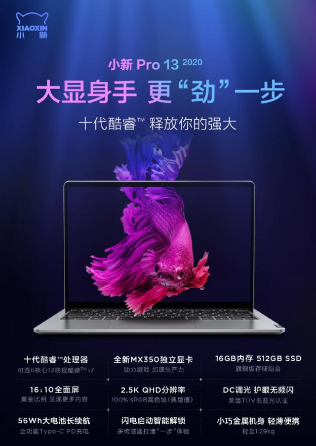 根据官方介绍,联想小新Pro 13 2020款升级十代酷睿处理器,搭载全新MX350独立显卡,16GB内存,512GB SSD,采用16:10全面屏设计,分辨率为2.5K,100%sRGB高色域屏幕,支持DC调光,配备56Wh大电池,机身重量仅1.29kg。