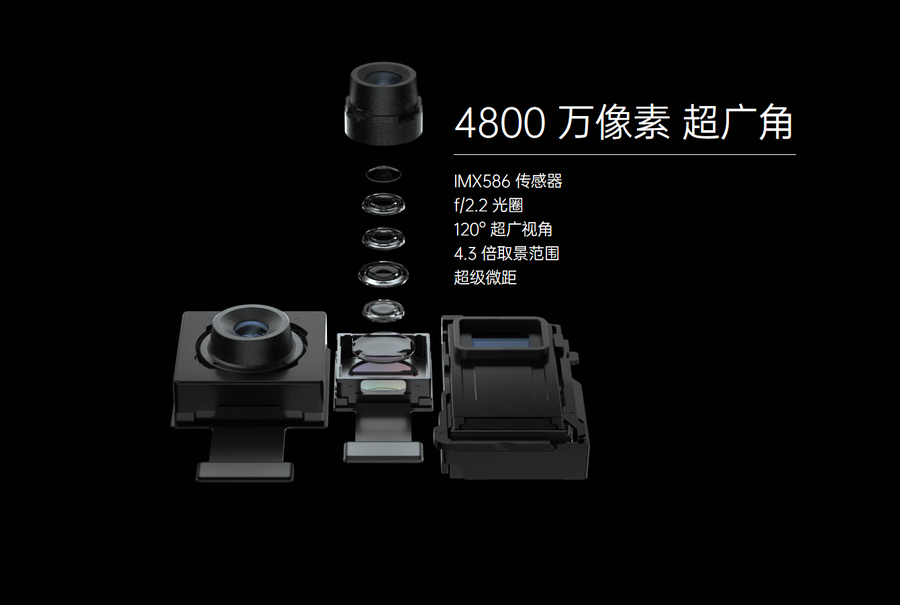 超广角镜头为索尼IMX586传感器,拥有f/2.2光圈,能提供120°开阔视野。通过这颗镜头除了可以实现超广角拍摄外,还支持3cm微距拍摄,可以探寻不一样的美景。