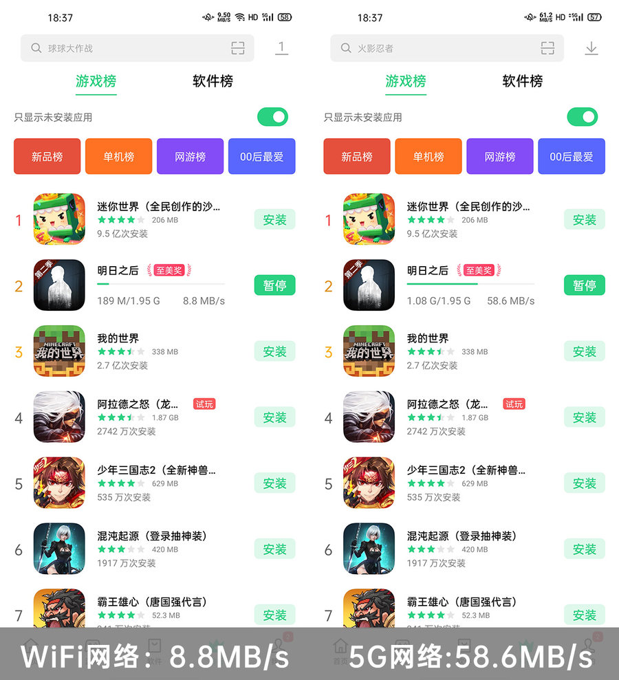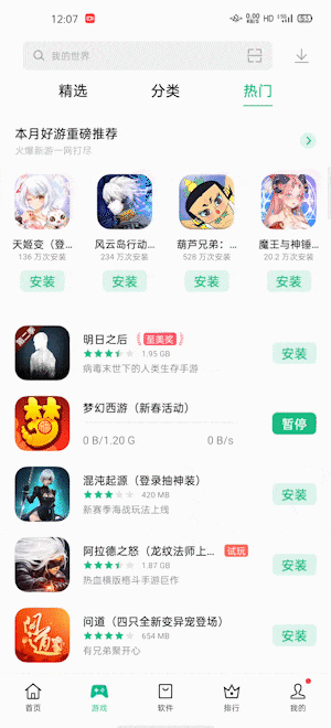 在实际测试中,在5G网络下载一个1.2GB大小的游戏大概只要32秒,下载全程基本都能保持在50MB/s以上。另外值得一提的是,得益于强大的性能加持,游戏的安装速度也非常快,在OPPO软件商店下载后,完成安装只需约2秒的时间。