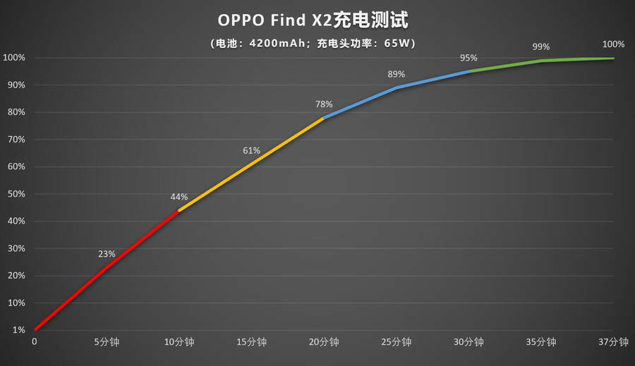 因为Find X2配备了65W超级闪充,10分钟就能增加43%的电量,达到100%的电量只需37分钟。快速回电能够降低用户因为5G增加功耗所带来的续航焦虑,使用更加放心。