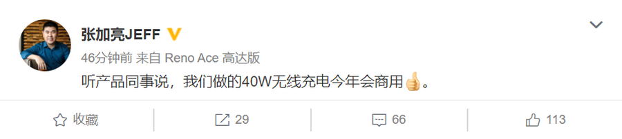 今天,OPPO VOOC闪充首席科学家张加亮JEFF在微博爆料,OPPO的40W无线充电会在今年商用。现在爆料的时间点刚好在Reno Ace2的预热期内,所以有网友猜测Reno Ace2有可能会先发40W无线充电。