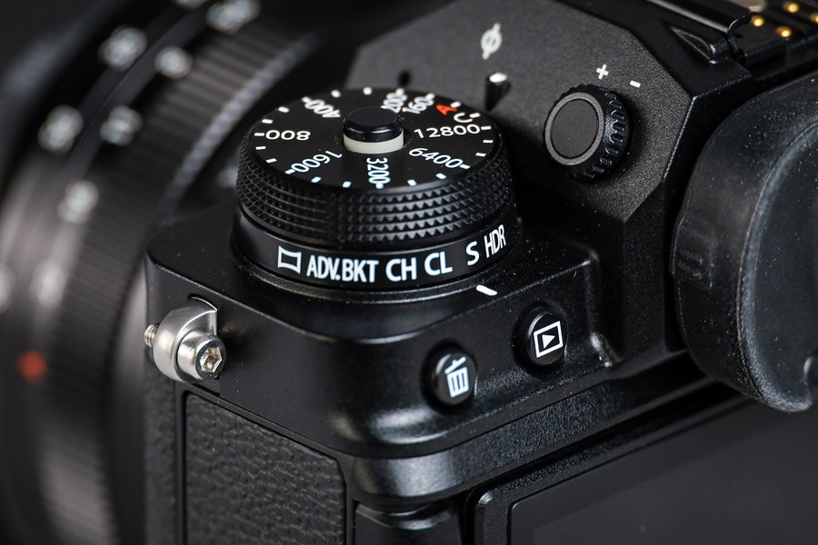 机顶右侧为感光度与驱动模式同样为双层转盘设计,感光度可在ISO 160-12800之间手动调整,如果需要只用更高的感光度则需转至“C”档位,并且可进入相机中设置该档位的ISO数值。