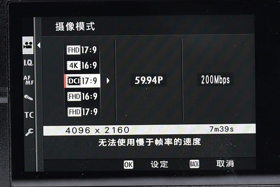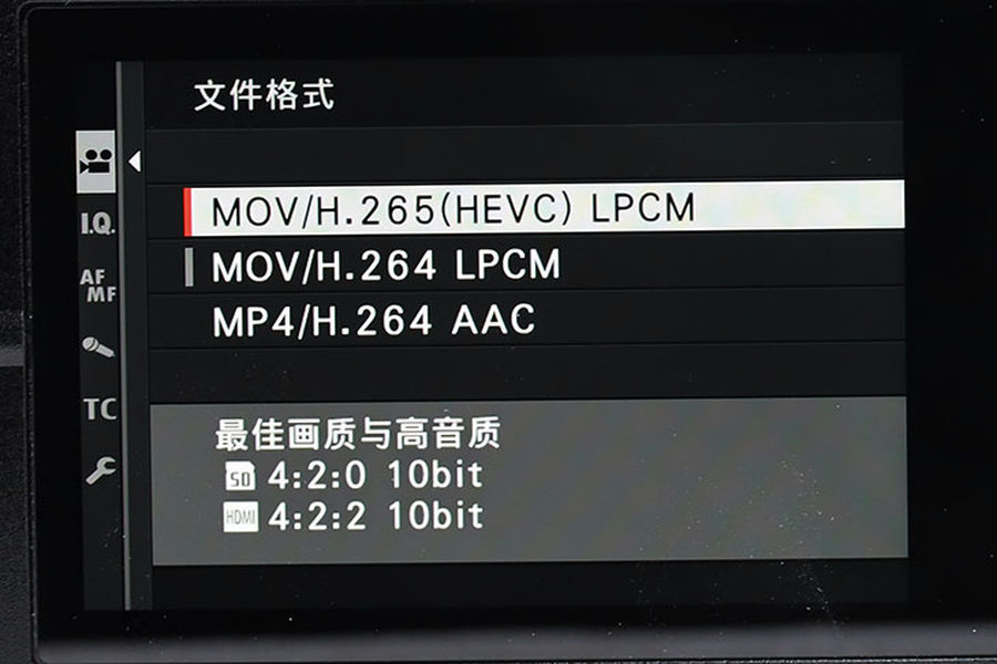 在记录视频文件格式时,富士给了用户自己选择编码的权利,H.264或者新一代H.265/HEVC格式,码率高可达400Mbps,另外All-Intra和Long-GOP也是可以自行决定。