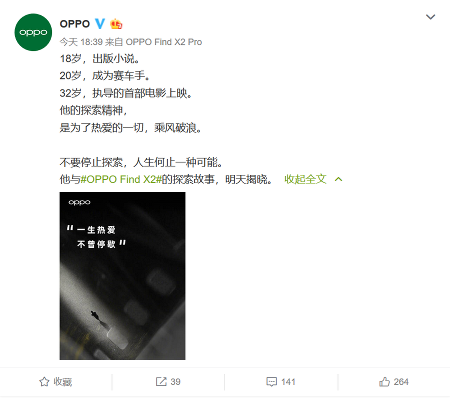 韩寒在不同领域对优异的探索和追求,带来了所有这些卓越成就。这种探索优异的精神,与Find X2系列在用户体验方面的优异探索类似,能够与OPPO的探索基因产生共鸣,带来更加清晰的品牌形象展示。